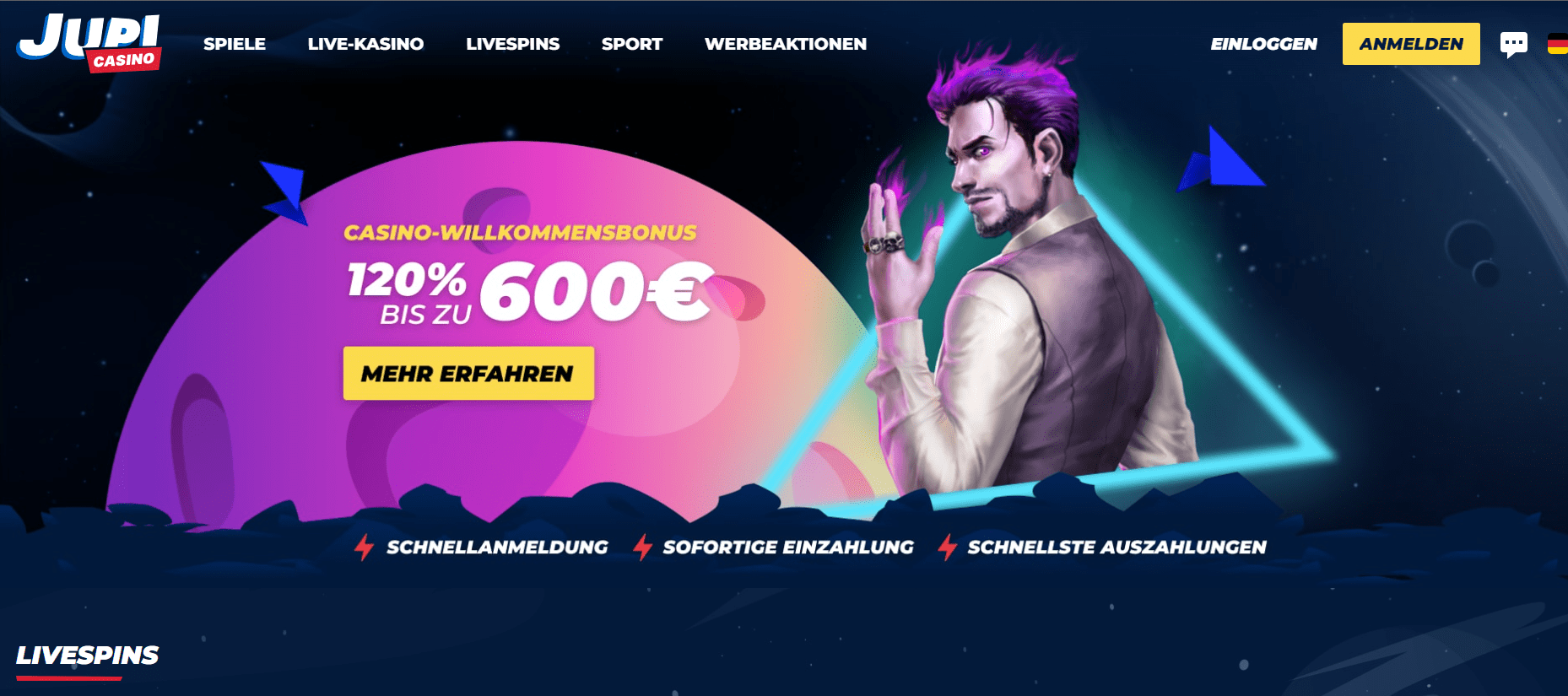 Jupi Casino ist ein Online-Casino mit mehreren Währungen und einer Sportwettenplattform mit einem Planetenthema. Die besten Gaming-Unternehmen wie Microgaming, NetEnt, Play'n GO, Betsoft, Elk Studios, BGaming und andere bieten Spielern eine breite Auswahl an Spielen. Die Website ist von fast jedem internetfähigen oder mobilen Gerät aus zugänglich und Spieler können ihre bevorzugte Sprache auswählen. Die Regierung von Curaçao gewährt Jupi Casino außerdem eine vollständige Lizenz und strenge Vorschriften.