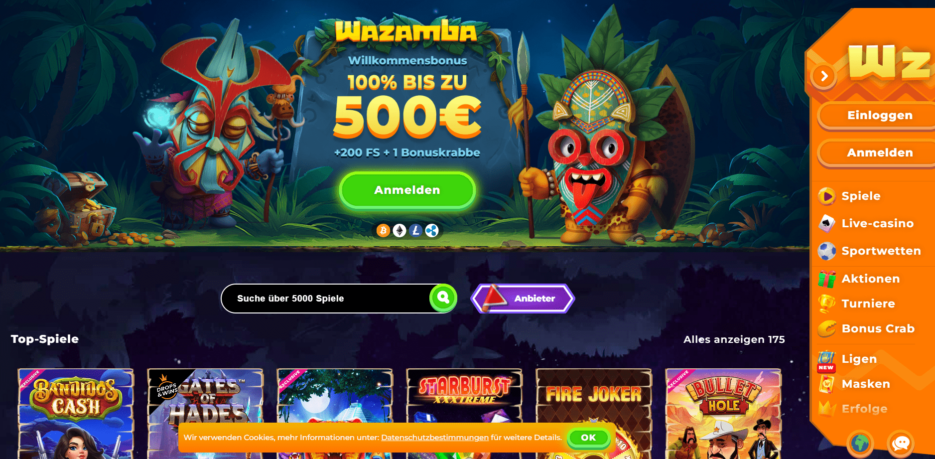 Members at the online casino Wazamba Casino can try their luck at a variety of games, such as video slots, table games, and more. Players can select one of three totem-like characters to play as they explore the casino, complete game objectives, earn achievements, and eventually exchange coins for bonuses and other goodies. The website also features a number of top-tier, high-quality software developers, such as NetEnt, Microgaming, Yggdrasil Gaming, Betsoft, iSoftBet, Habanero, GameArt, Quickspin, and Pragmatic Play. Members of the site can play immediately through a web browser and the site supports multiple languages, including English, German, and Russian. Through their mobile casino, they are also accessible while on the go. The Curacaoan government issues licenses and enforces regulations to Wazamba Casino.