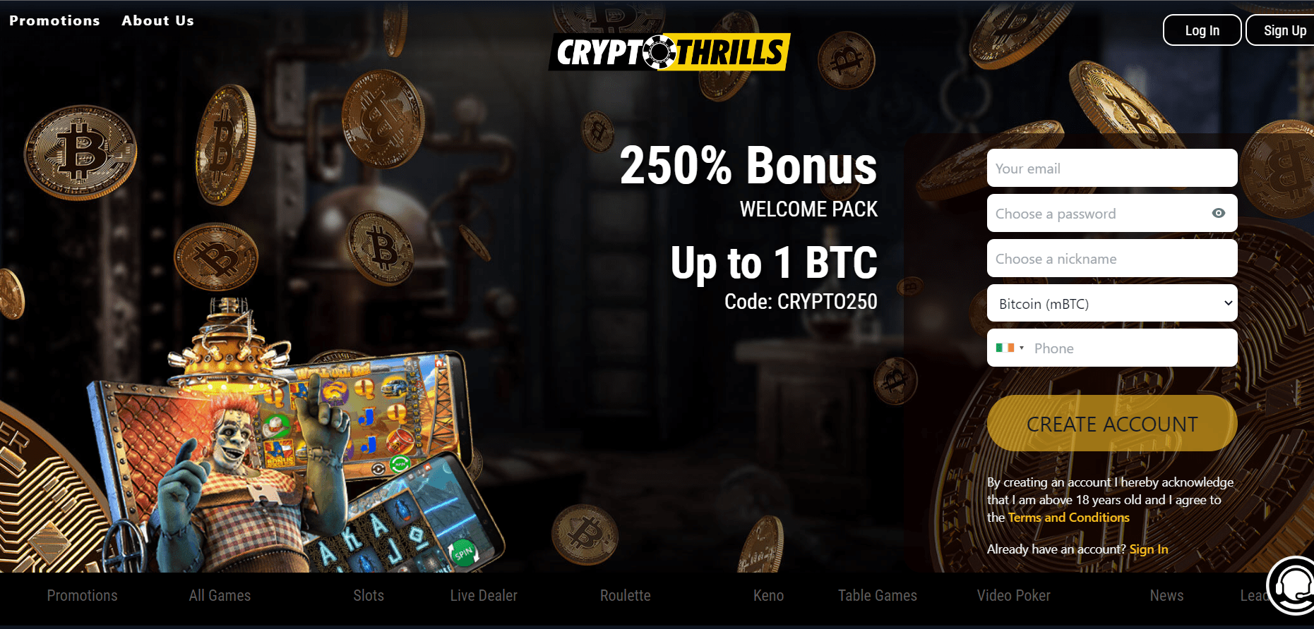 Crypto Thrills er et virtuelt casino, der kun har kryptovaluta, og som har været i drift siden 2019. Kasinoeksperter vil ikke finde spil med rigtige penge i den forstand, men de kan begynde at spille på gambling-webstedet ved hjælp af Bitcoin, Bitcoin Cash eller Litecoin. Det ideelle casino for entusiaster, der ønsker at føle suset med at placere væddemål ved hjælp af den velkendte kryptovaluta er Crypto Thrills. Dette adskiller det specifikke virtuelle casino fra dets rivaler.